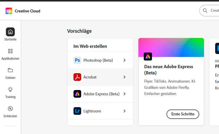 1.: Photoshop CC 4.6 BETA ( und Photoshop Express BETA) – ok man könnte jetzt sagen, dass sind ja keine Assets, aber es sind ja auch keine Vollversionen und ich hab die Dinger ja zusätzlich installiert, weil ich das generative Zeug voll funky finde, von daher, in meiner Welt sind das Assets, und diese sind als Photoshop BETA direkt in der Crative Cloud Desktop App lokal am Rechner zu installieren oder die Adobe Express BETA aus der gestarteten Adobe Express Version heraus (direkt im Browser) wenn ihr einfach rechts oben auf das kleine Adobe Logo klickt und dann auf: