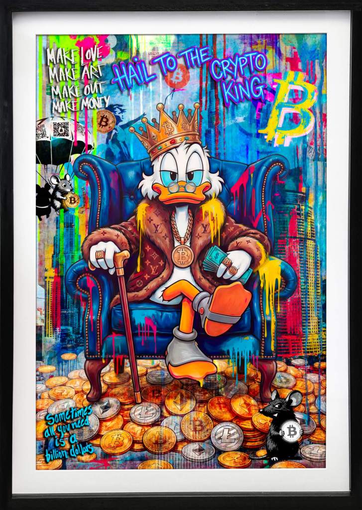 Der Crypto King Dagobert ist verkauft. Das exklusive Büttenpapier, die erhabenen Acrylschichten, der meisterhaft gefertigte Spezialrahmen – all das gehört nun zur Privatsphäre eines anderen Menschen. Das Unikat ist vom Markt.