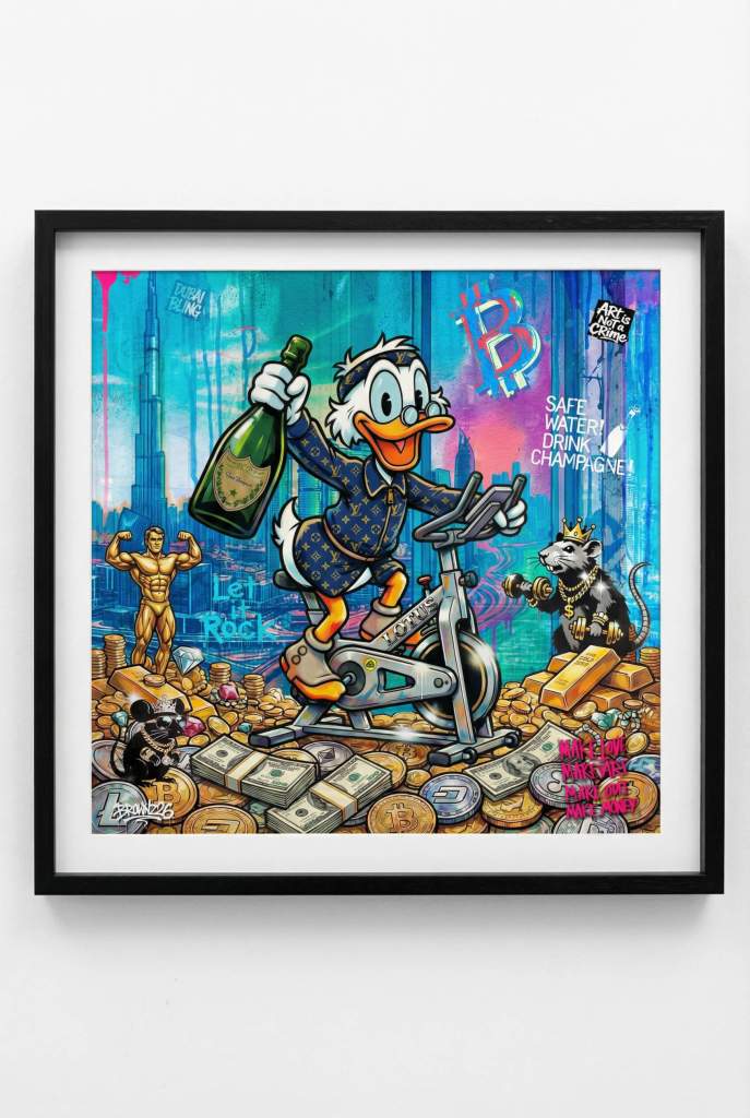 Da sitzt eine ikonische Ente – geschniegelt, im Luxus-Look – auf einem Bike und tritt in die Pedale, als hätte Erfolg persönlich gerade den Turbo eingelegt. In der Hand: eine Flasche Champagner. Drumherum: Goldbarren, Bargeld, Crypto-Symbole. Das volle Programm.