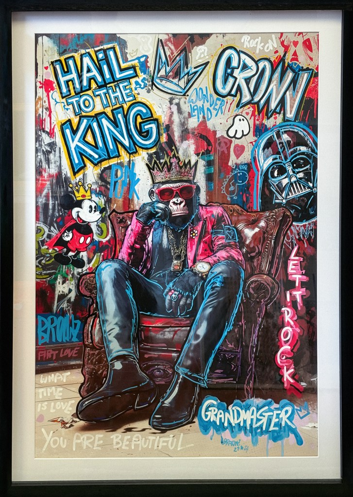 „Hail to the King“ ist eine Mischung aus kraftvollen Symbolen und einer stilisierten Darstellung eines Affen, der sich in einer Pose der coolen Überlegenheit zurücklehnt – eine Art moderne Königsfigur in der Popkultur. Der Affe trägt eine glänzende Krone und eine Lederjacke, die durch die Verwendung von Acrylfarben und Acrylstiften auf dem Bild lebendig wird. Charakteristische Street Art-Elemente wie Graffiti-Schriftzüge und Versatzstücke aus der digitalen Welt – etwa die Verschmelzung von Mickey Mouse und Darth Vader – verbinden sich zu einer kraftvollen visuellen Aussage.