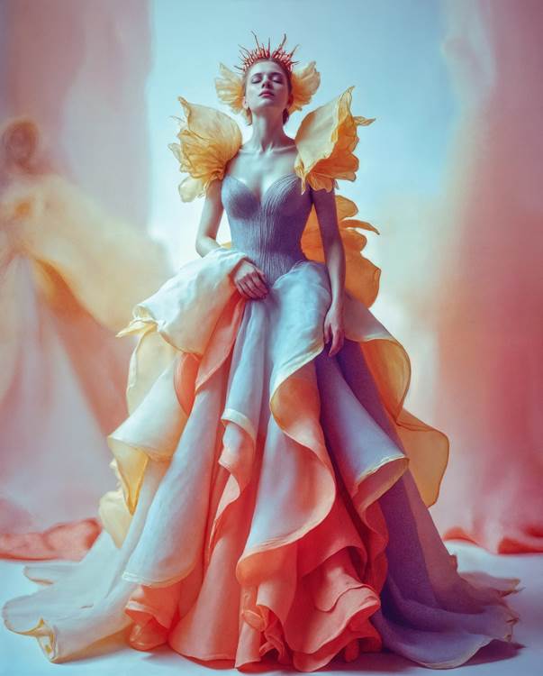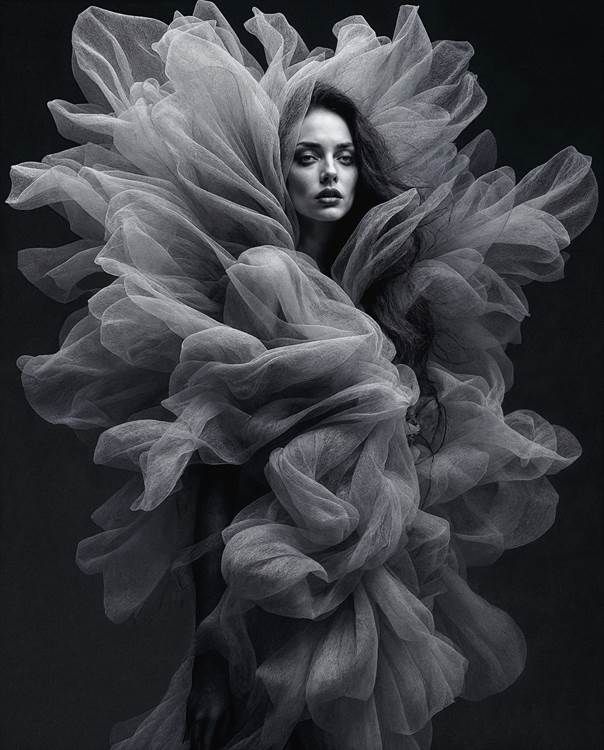 Magnific Prompt: The photograph is a meticulously crafted, high-fashion, black and white studio portrait that transcends mere representation, venturing into the realm of surrealism and dramatic visual storytelling. The model, whose face is partially obscured and dramatically made up, is less a person and more a sculptural element within the composition. The figure is not simply wearing the gown; the gown and the figure appear almost symbiotically intertwined, suggesting a metamorphosis or a blurring of boundaries between the human form and the fabric. The gown itself is the true protagonist. It is a chaotic yet controlled explosion of sheer fabric—likely tulle or organza—arranged in a manner that defies gravity and conventional draping. The layers are not passively draped; they actively twist, swirl, and billow, creating a sense of restless energy and hidden movement. The texture is paramount; the photograph is a study in contrasts, highlighting the delicate translucence of the fabric in some areas while plunging others into deep shadow, creating a sense of both fragility and formidable presence. The folds and creases are not merely incidental; they are carefully sculpted to evoke a sense of depth and internal complexity, hinting at a hidden world within the fabric’s folds. The elaborate headpiece, a crown-like structure of similarly textured fabric, completes the surreal effect. It is not merely an accessory; it is an integral part of the figure’s transformation, a symbolic element that adds to the sense of otherworldliness and perhaps even confinement within the fabric’s embrace. The stark, even grey background is not just a neutral backdrop; it is a crucial element in isolating and emphasizing the model and gown, creating a sense of isolation and heightened drama. The lighting is not simply illuminating; it is sculpting the form, using light and shadow to create a chiaroscuro effect that enhances the three-dimensionality and texture of the fabric. The interplay of light and shadow suggests a hidden depth, a world contained within the folds, inviting the viewer to explore the unseen. The black and white format is not a mere stylistic choice; it is essential to the photograph’s surreal and dramatic effect. The absence of color intensifies the contrasts between light and shadow, texture, and form, creating a heightened sense of drama and visual impact. The overall effect is a powerful, unsettling, and unforgettable image that transcends the boundaries of fashion photography, entering the realm of fine art, a visual exploration of texture, form, and the surreal transformation of the human form. The photograph is a meticulously crafted piece of dark art, a gothic full body portrait that transcends mere representation to become a visceral experience of horror and decadent beauty. The central figure, a screaming vampire queen, is not simply depicted; she is embodied by the swirling, chaotic fabric of her gown. This is not clothing; it is a second skin, a shroud woven from the very essence of darkness, clinging to her form like a living nightmare. The gown itself appears to be constructed from layers of black tulle or possibly a heavy, dark silk, its texture both delicate and menacing. The fabric is not passively draped; it writhes and twists, suggesting an internal struggle, a restless energy that mirrors the queen’s tormented soul. Close examination reveals the fabric’s intricate textural details: the subtle sheen of silk, the delicate fraying of tulle, the way the light catches the folds to reveal hidden depths and shadows. These details are not incidental; they are carefully orchestrated to create a sense of unease and impending doom. The queen’s scream, though silent in the image, is palpable. Her face, partially obscured by shadow and contorted in a silent shriek, is a masterpiece of macabre beauty. The makeup, likely pale and stark against the darkness of her attire, accentuates her gaunt features, highlighting hollow cheeks and shadowed eyes. The expression is not merely pain; it is a blend of rage, anguish, and a chilling, almost triumphant defiance. Her mouth is agape in a silent scream, a testament to her eternal torment and her enduring power. Even the subtle details of her makeup, the precise application of shadow, the stark contrast between light and dark, contribute to the overall effect of unsettling beauty. The elaborate headpiece, a crown of thorns fashioned from twisted, blackened fabric, is not a symbol of royalty but a macabre headdress, a crown of suffering. Its jagged edges and uneven texture mirror the queen’s tormented state, suggesting a fusion of power and despair. The thorns themselves appear almost organic, as if grown from the very fabric of her darkness. The background is not merely a void; it is a representation of the abyss, a black nothingness that amplifies the queen’s isolation and emphasizes her spectral presence. The absence of any other element focuses all attention on the queen, solidifying her dominance within the frame. The lighting is masterfully controlled, using chiaroscuro to sculpt the queen’s form from the darkness, highlighting her skeletal features and the horrifying details of her attire. The shadows are not merely incidental; they are integral to the image’s power, creating a sense of depth and mystery, hinting at the unseen horrors lurking within the folds of her gown. The black and white format is not a stylistic choice; it is essential to the image’s gothic aesthetic. The absence of color enhances the sense of decay and despair, transforming the image into a chilling monochrome study of death and darkness. The photograph is not simply a portrait; it is a dark ritual, a summoning of the vampire queen’s terrifying presence, a testament to the power of darkness and the enduring allure of the macabre. It is a chilling exploration of gothic horror, a visual poem that lingers in the mind long after the image is see