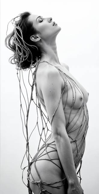 MAGNIFIC: The Image is a stylized Photograph or digital artwork depicting a slender female figure seemingly entangled in a web or network of dark, string-like Material. The woman’s body is arched backward in a graceful, almost balletic pose. Her skin is visible through the dark strands, which are wrapped tightly around her limbs and torso, creating a textured, almost sculptural effect. Her hair is dark and styled close to her head. Her expression is not visible. The background is plain and light, a stark white or off-white, which contrasts sharply with the dark, intricate web-like Material. The overall style is artistic and evocative, suggesting themes of entrapment, vulnerability, or perhaps transformation. The image’s mood is somewhat mysterious and ambiguous, leaving the viewer to interpret the narrative and emotional content. The lighting is even and diffused, avoiding harsh shadows and allowing the details of the figure and the web-like material to be clearly visible. The sharp contrast between the dark strands and the light background emphasizes the figure’s form and the intricate pattern of the web. The image likely involves digital manipulation or post-processing to achieve the seamless integration of the figure and the web-like Material. The level of detail and the precise rendering of the human form and the web suggest a high level of artistic skill and technical expertise.