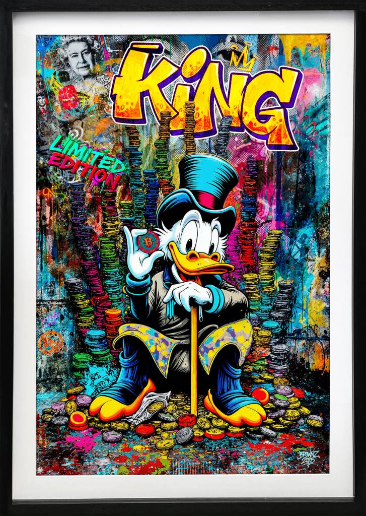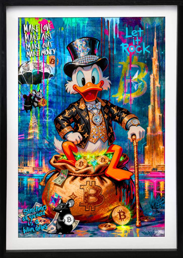 Er sitzt da im Glanz der Moderne – nicht spöttisch, sondern triumphal. Reichtum tropft von der Leinwand, als Hymne auf Mut, Vision und das Chaos der Kreativität. Keine Ente, kein Witz – ein Manifest. Luxus und Kunst, vereint unter einem Mantra: